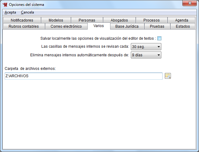 Quedará a cargo del administrador de la instalación establecer la ubicación final de la carpeta de archivos externos, luego de lo cual deberá definir la ruta de acceso a la misma (en Supervisión → Opciones del Sistema → Varios), que deberá ser una carpeta compartida, común a todas las terminales de la red local que vayan a accederla.